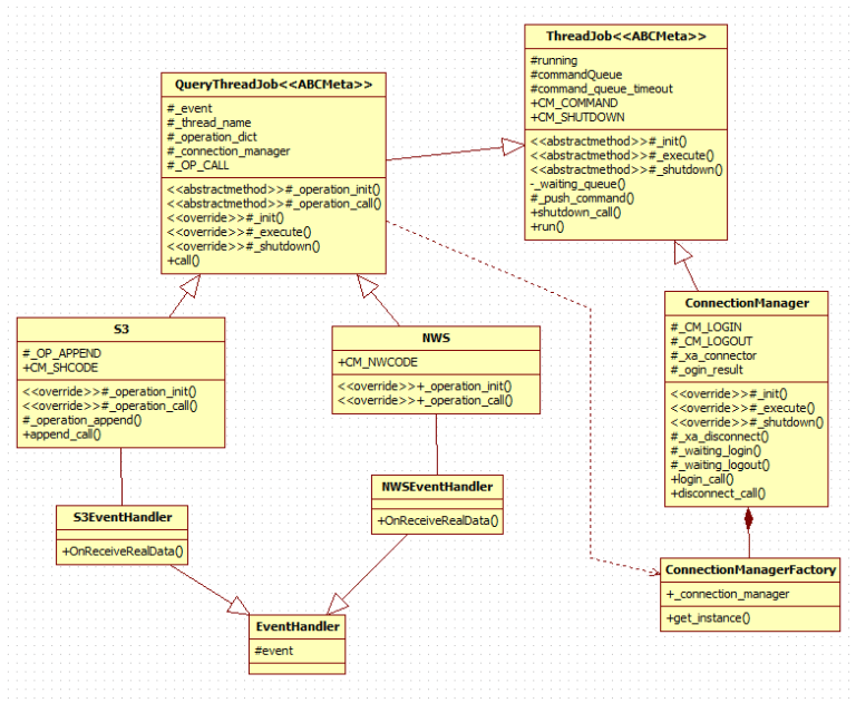 ThreadJob 추상화 클래스를 기준으로 성격이 다른 ConnectionManager와 QueryJob을 분류하였다. 이베스트에게 요청 및 응답받을 QueryJob은 공통기능만 묶어뒀고 각각의 Query(NWS, S3_)는 QueryJob 추상화 클래스를 상속받아 세부 구현이 가능하게 설계하였다.
