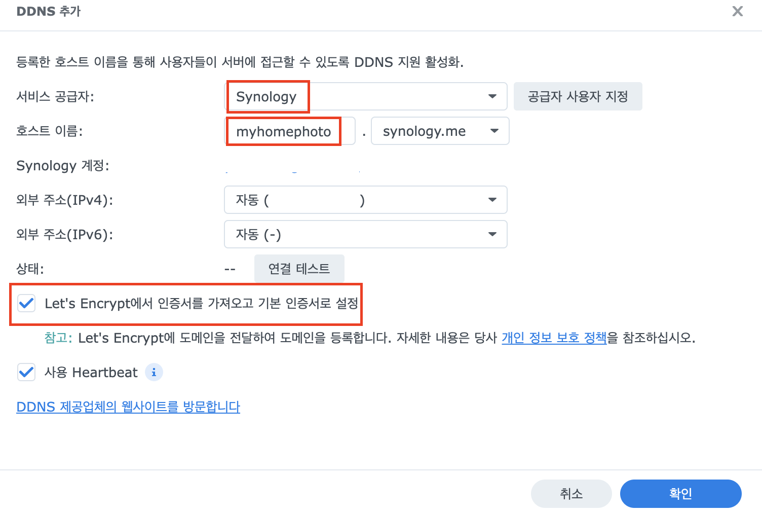 보통 가정용 인터넷은 유동 IP다. 외부 접속을 위해 DDNS를 많이 사용한다. iptime에서도 DDNS 서비스를 제공하고 시놀로지에서도 DDNS를 서비스해준다. 그러나 필자는 시놀로지의 DDNS 서비스를 이용하길 권장한다. 이유는 HTTPS 서비스를 할 때 사용하는 인증서 때문이다.