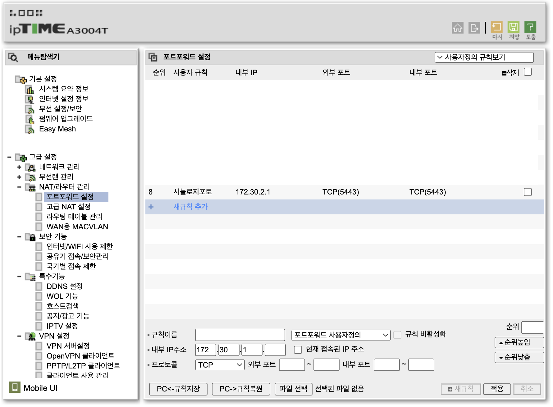 공유기 포트포워딩 설정 서비스 포트 번호 설정 후 외부 접속을 위해 공유기의 포트 포워딩을 설정한다. 외부 접속 및 홈네트워크 구성을 잘 모른다면 아래 글을 읽어 보면 이해할 것이다. 5443번 포트로 서비스 중이니 내부 IP의 5443번 포트를 포워딩 설정을 한다.