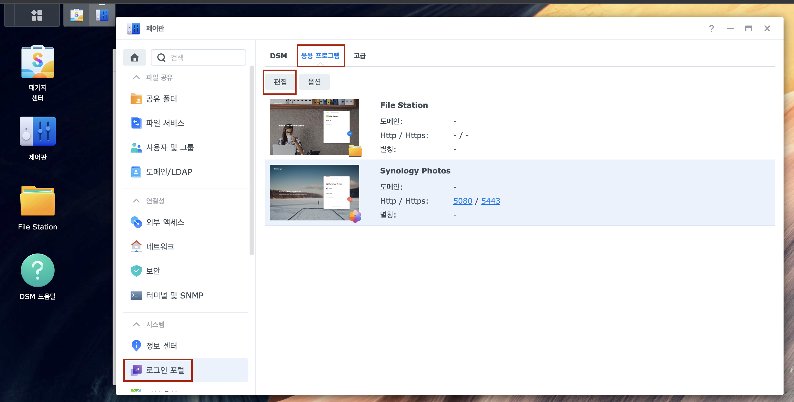 제어판 - 로그인 포털 - 응용프로그램 제어판 아이콘을 클릭 후 '로그인 포털', 응용프로그램, Synology Photos 선택 후 편집을 클릭한다.