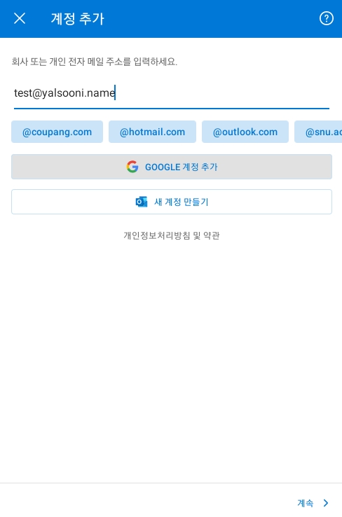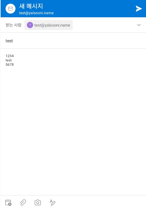 test란 계정을 생성하였으니 마이크로소프트 outlook 어플을 이용해 test@yalsooni.name으로 메일을 수발신 해보겠다.