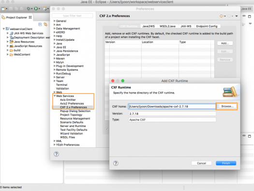 이클립스 – 환경설정 – Web Services – CXF Preferences 화면에서 ‘Add’버튼을 눌러 cxf의 홈디렉토리를 설정 후 ‘Finish’버튼을 눌러 설정을 완료한다. b) wsdl2java