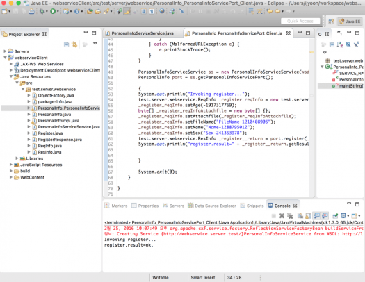 wsdl 제너레이터 설정에서 level을 Deploy client까지 주었다면 서비스이름+_Client.java 파일이 같이 생성될 것이다. 이 자바 파일을 확인해보면 main 메서드가 존재한다. value object의 값만 원하는 걸로 변경 후 자바 애플리케이션으로 실행해 보면 웹서비스 제공자에게 호출하는 걸 알 수 있다.
