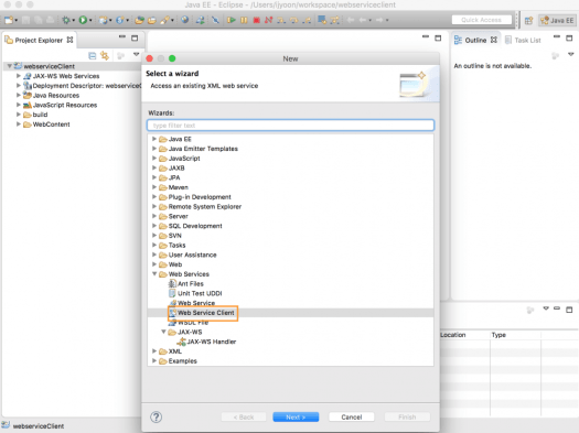 프로젝트 우클릭 > New > Other > Web Services > Web Service Client 선택 후 Next.