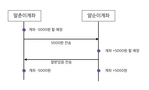 이 예제에서 눈여겨볼 부분은 마지막이다. 말 춘계좌와 얄 순계좌는 서로의 요청과 응답을 확인한 후 같은 일을 동시에 진행했다.