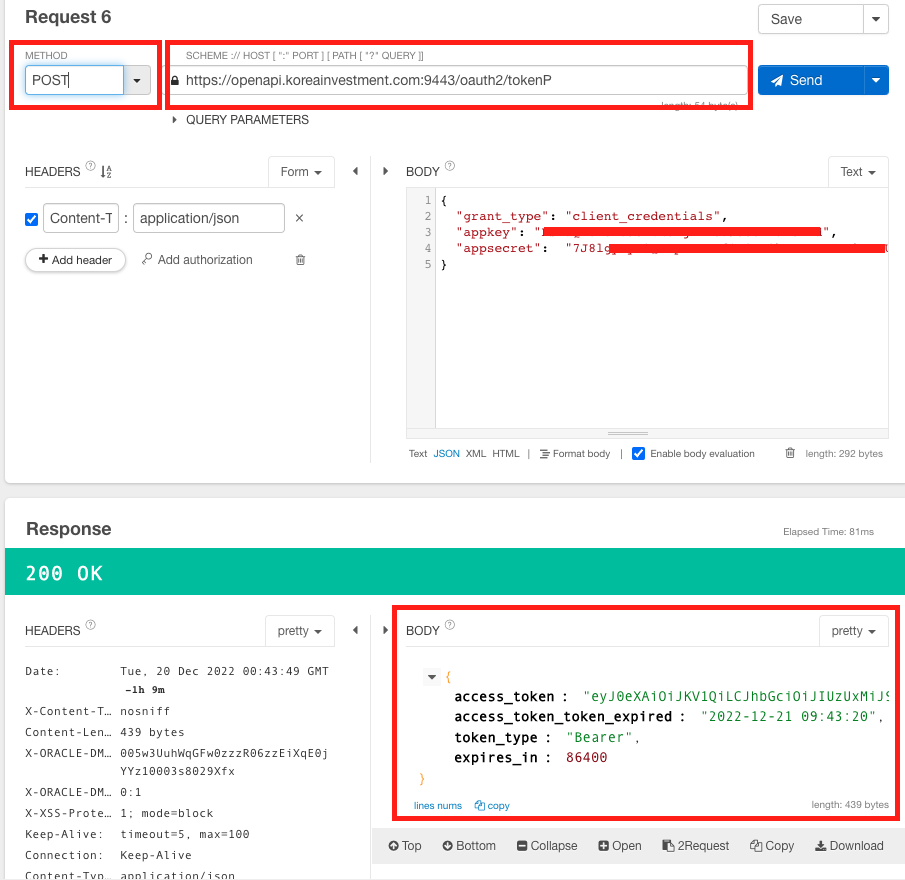 oauth 인증이기 때문에 api 신청시 발급받은 app key와 app secret값으로 토큰을 받을 수 있다. /oauth2/tokenP URI로 값을 넘기면 하루 동안 사용할 수 있는 토큰 값을 응답으로 준다. 이 토큰으로 다른 URI를 호출할 때 인증값으로 사용한다.
