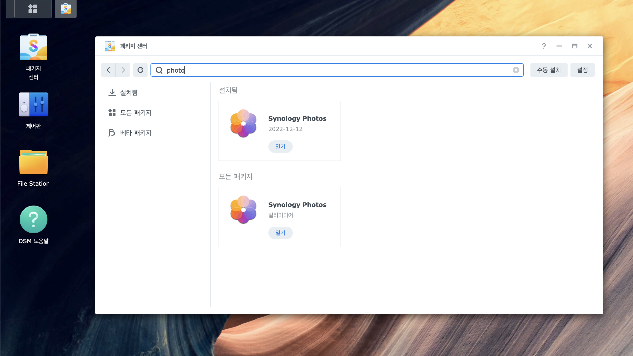 패키지 센터에서 photo를 검색하면 Synology Photos가 나온다. DSM 7.0 이상부턴 Photo Station 및 Moments가 사라지고 Synology Photos로 대체되었다. 설치 버튼을 누르면 설치가 진행된다.