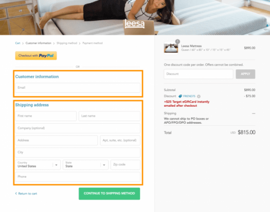 customer information e-mail 기입란이 있는데 꼭 유효한 이메일로 적어야 한다. 배송 관련 정보도 이메일로 보내 주기 때문이다. shipping address의 이름은 신용카드에 적힌 자기 이름으로 하는 게 좋고 주소는 배대지에서 알려준 주소를 기입한다. 배대지에서도 받을 수 있는 주소를 여러 개 제공하는데 그중에서 델라웨어(DE) 주소를 적으면 세금이 없다.